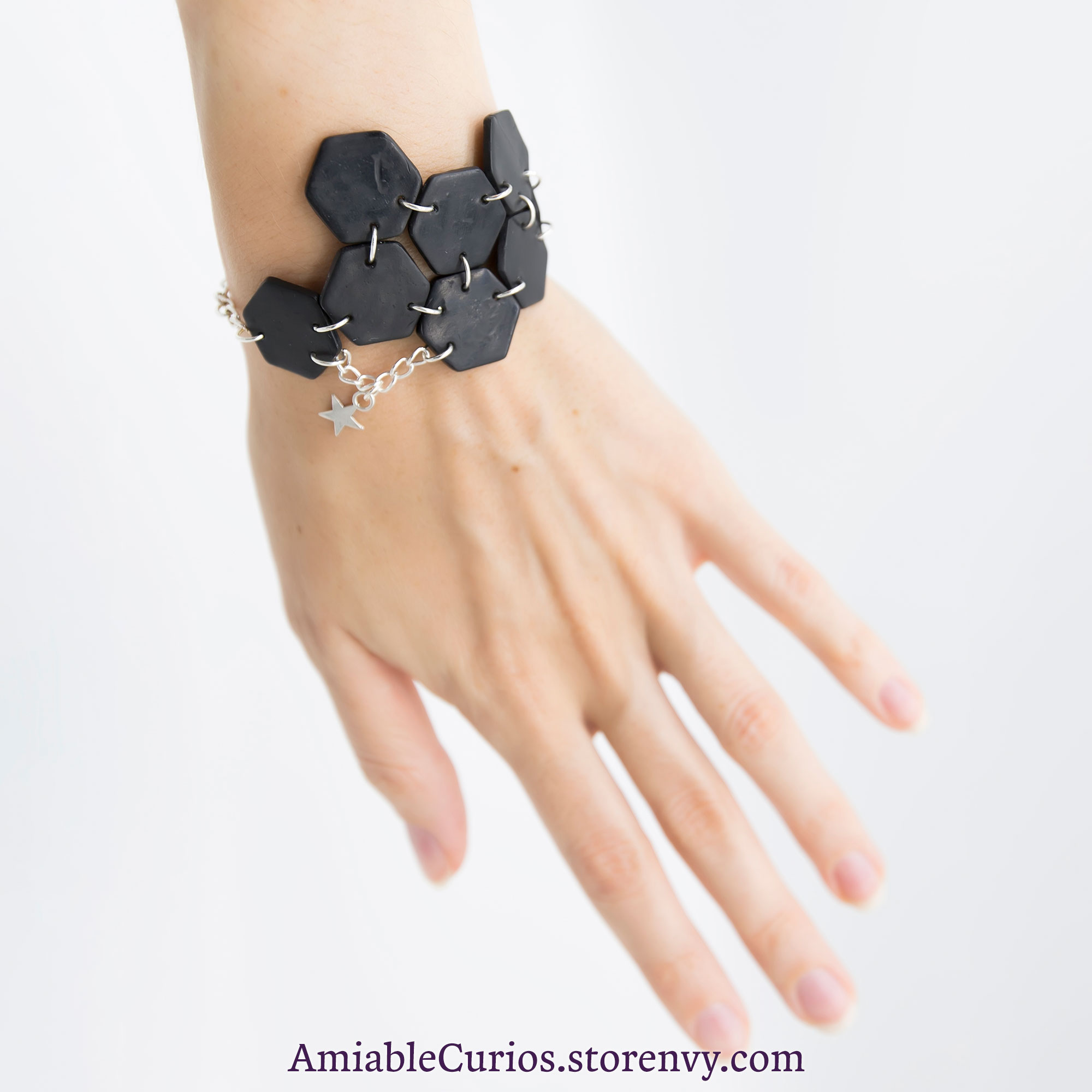 Heat Tile Bracelet, SpaceX Starship Inspired, black, hexagon, polymer clay, abstract design, tiled, unique, ooak, chain, cosmic, space, spaceship
