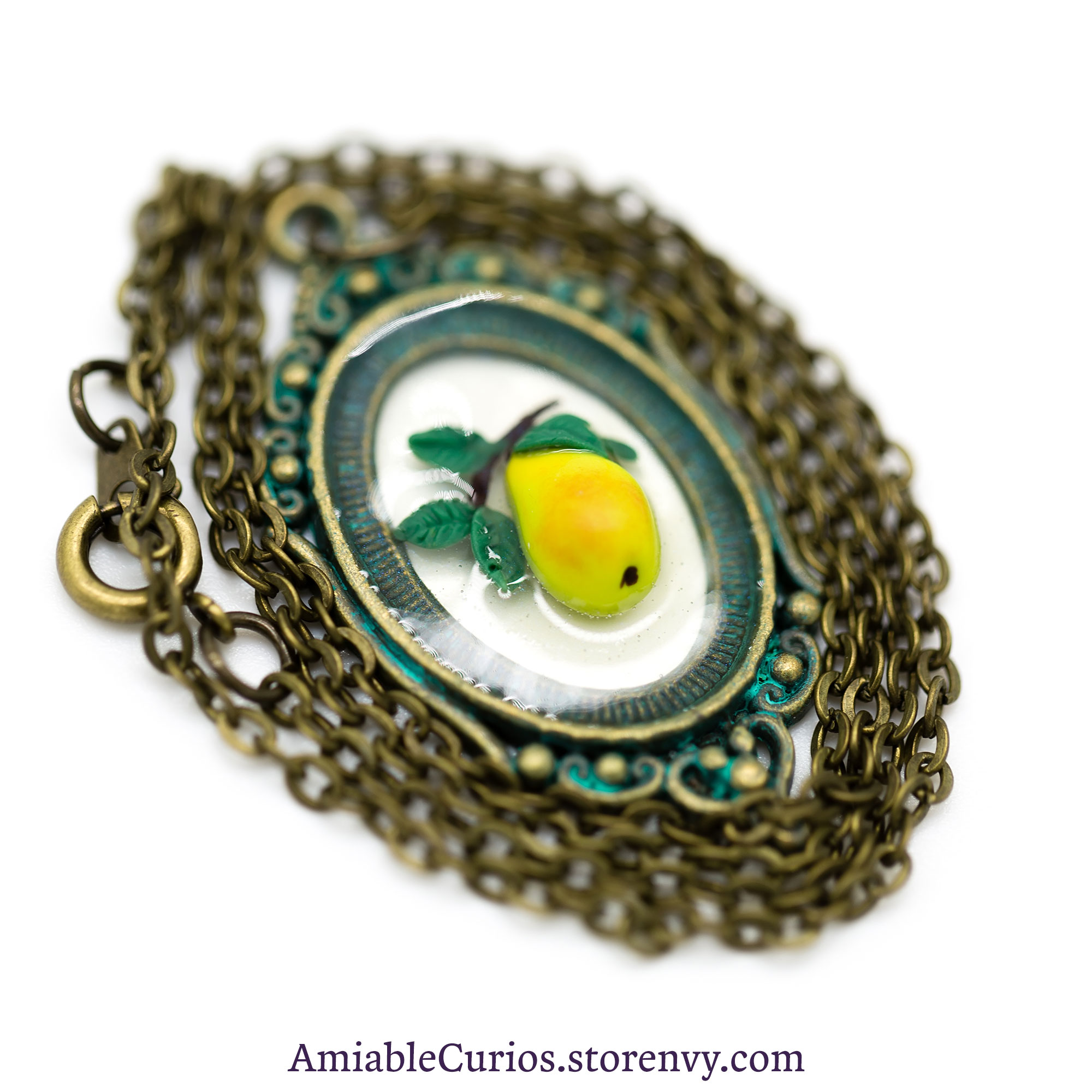 This cameo is one of the first resin series called "Floating fruits" done by Oksana. This one of a kind pendant features a miniature yellow pear on a branch suspended seemingly in midair inside an antique bronze cameo. In reality, the pear is held in place by translucent with a touch of sparkle resin. The resin is high quality and non-yellowing. The miniature pear with leaves is made by hand out of polymer clay. The cameo base is made of bronze; the chain is 18 inches long and also made of brass. The pendant is about 1½ inch tall and 1 inch wide. This necklace would make a great gift for all nature lovers.