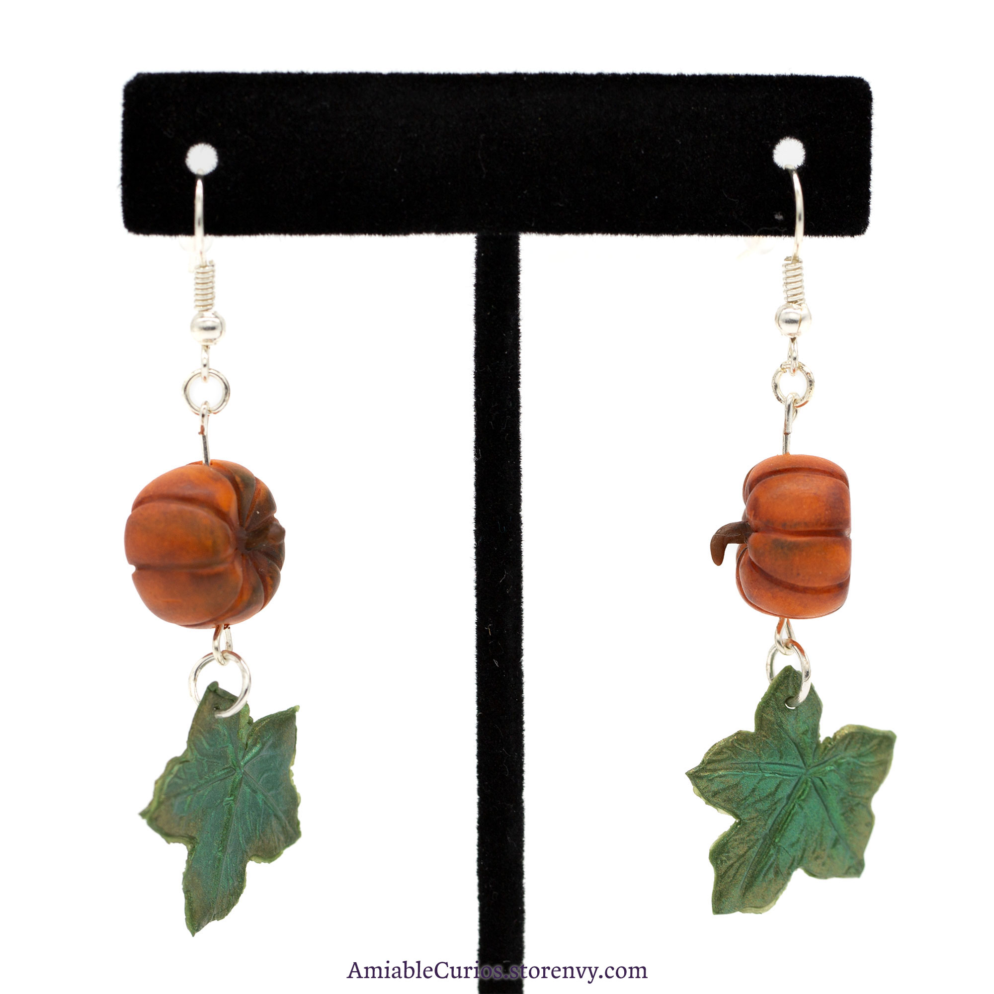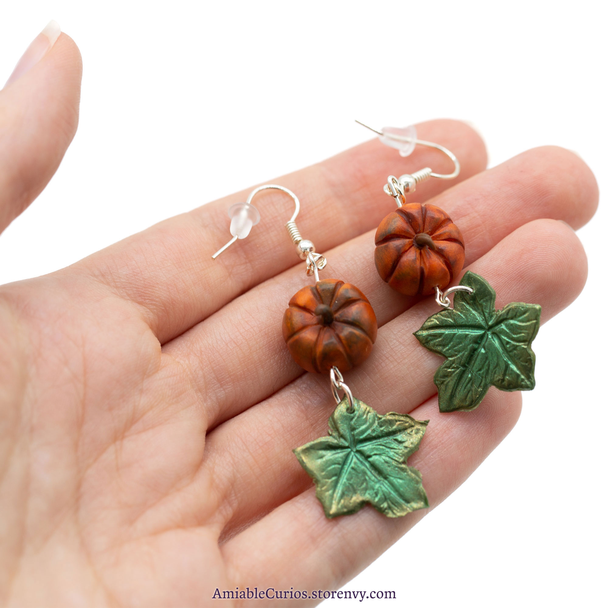 This set of pumpkin earrings is hand made out of polymer clay and nickel-free metal findings. Two pumpkins and two leaves are sculpted and toned by hand. While the leaves are toned with gold to add sparkle to the overall look, the pumpkins are made to look realistic. These dangle and drop style earrings are 2.5 inch long. The fishhook earrings come with a silicone stopper to keep them in place. Complete your autumn look with a pair of these orange pumpkin with green leaves earrings!