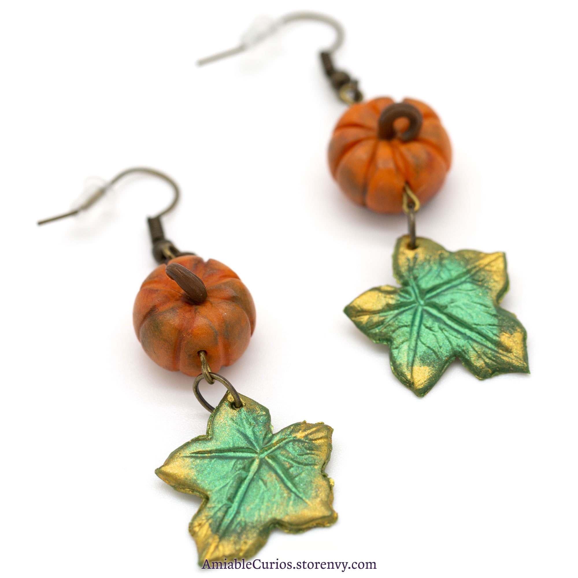 This set of pumpkin earrings is hand made out of polymer clay and nickel-free brass metal findings. Two pumpkins and two leaves are sculpted and toned by hand. While the leaves are toned with gold to add sparkle to the overall look, the pumpkins are made to look realistic. These dangle and drop style earrings are 2.5 inch long. The brass fishhook earrings come with a silicone stopper to keep them in place. Complete your autumn look with a pair of these orange pumpkins with green leaves earrings! They come in a free gift box and are ready to be gifted.