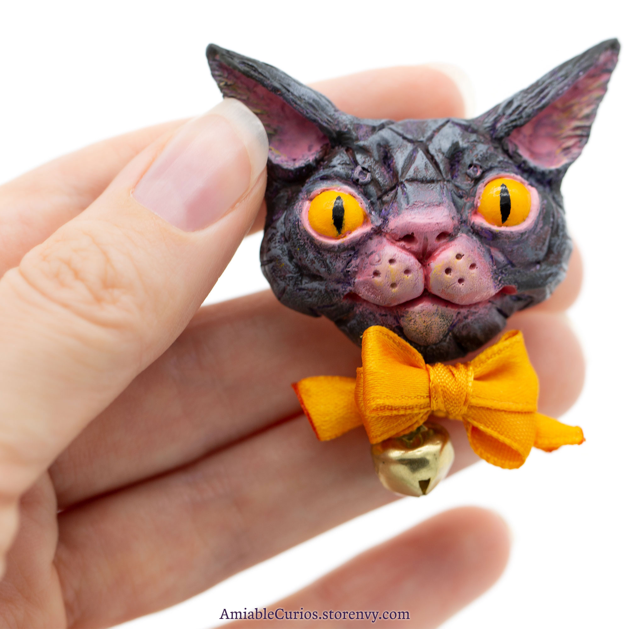 This brooch is a cast from a master sculpt of the cat. While there are other casts like this, the customization is unique. The paint and the details are one of a kind. The cast is available as necklace as well.