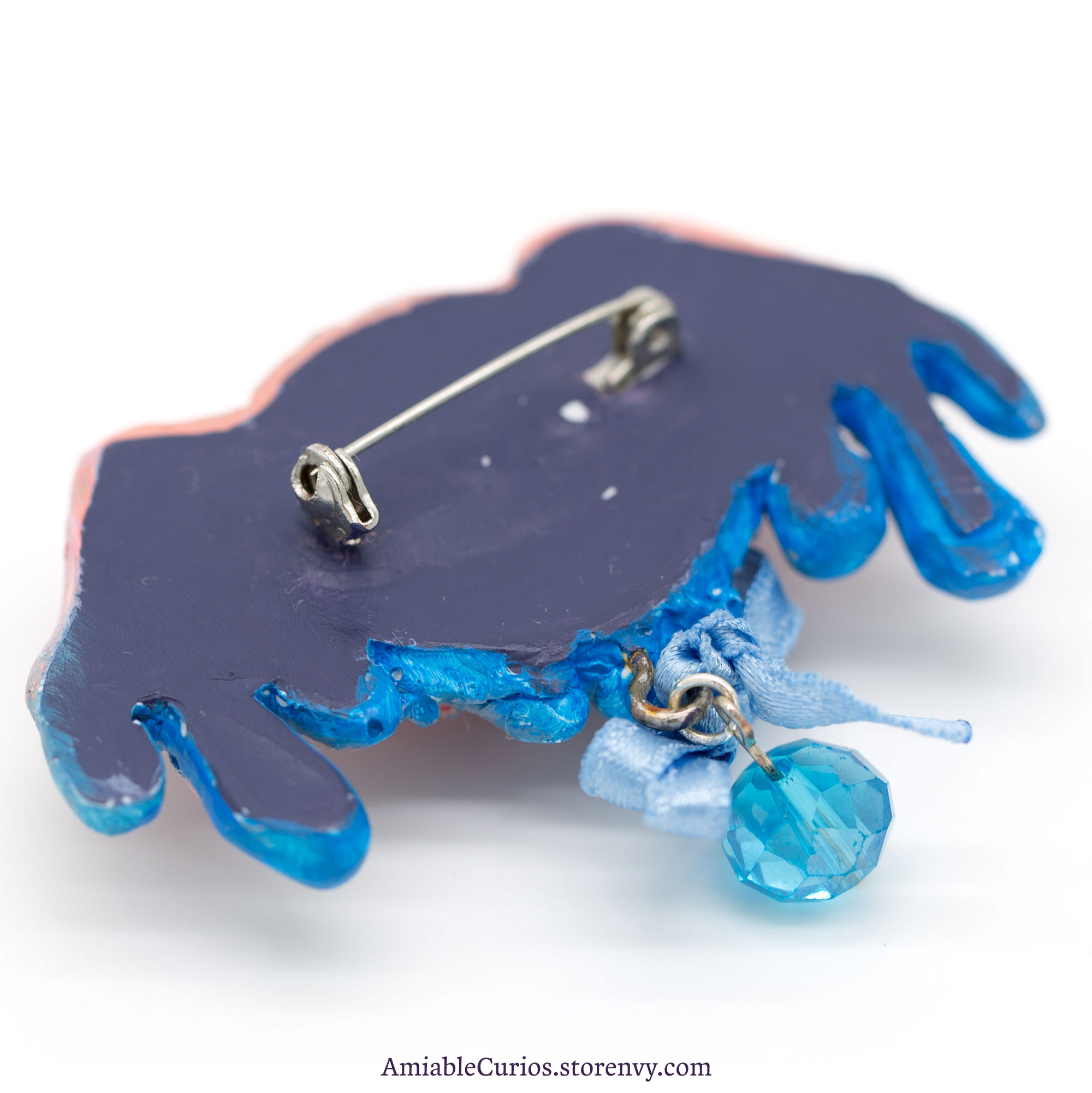 - Materials used: high quality resin, acrylic paint, metal safety pin, fabric ribbon, glass bead