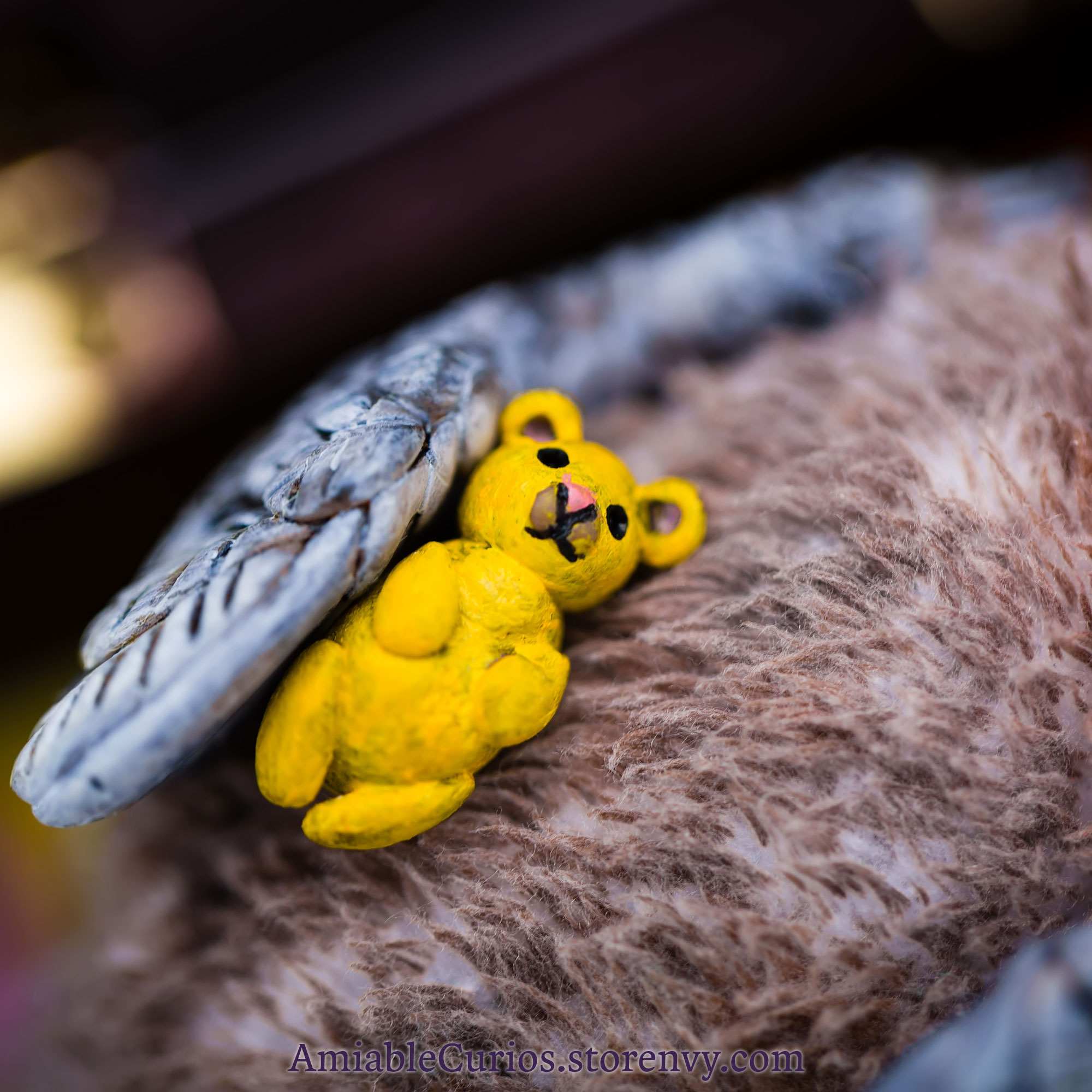 The art doll is handmade out of polymer clay, fabric, glass, beads, wood, and metal findings. The trunk has a mattress and a pillow, both of them are removable. The trunk will not close with an owl inside; we wouldn’t want to lock her in! The trunk is about 2.5 by 3.5 inches. The owl is about 4 inches tall, and the teddy bear is about 0.6 inch. Owl’s wings are movable; she can hug either her teddy bear or the pillow. The doll is meant to be positioned horizontally, as if she’s asleep. It is possible to balance her to stand, but not without support. This is not a toy and meant to be treasured and appreciated by an adult.